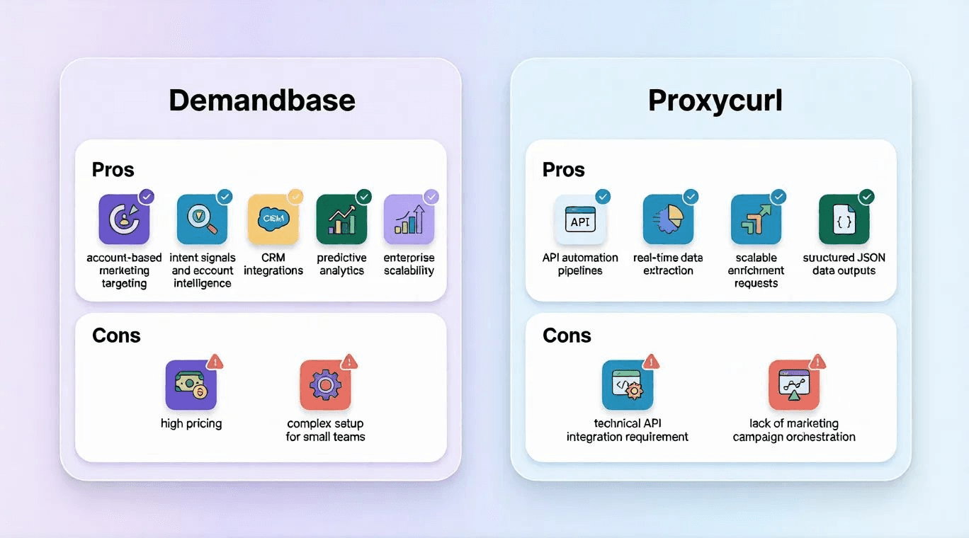 Understanding the advantages and limitations of each platform helps teams make informed decisions. Demandbase and Proxycurl excel in different areas, so weighing their pros and cons clarifies which fits specific workflows.