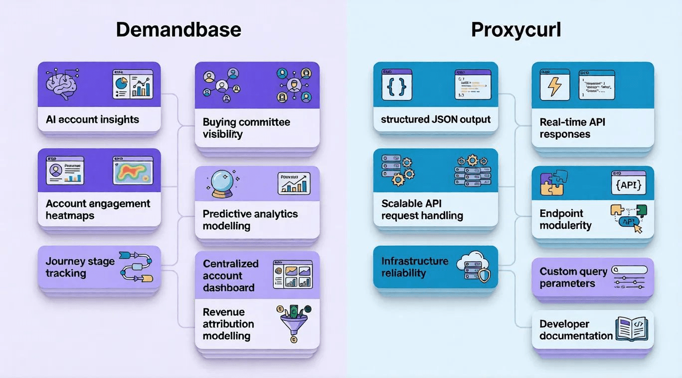Demandbase and Proxycurl offer distinct feature sets because they address different problems. Demandbase focuses on account intelligence, predictive insights, and ABM optimization. Proxycurl focuses on structured data retrieval, enrichment flexibility, and developer control. The features below exclude previously listed services and highlight product-level capabilities.