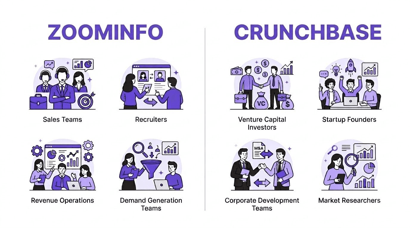ZoomInfo and Crunchbase cater to distinct professional segments within the business ecosystem by providing different layers of intelligence. ZoomInfo focuses on the "execution" phase of sales, providing the depth of contact required for high-volume outreach. Crunchbase focuses on the "discovery" phase, offering the financial and market signals needed for strategic research and investment analysis.