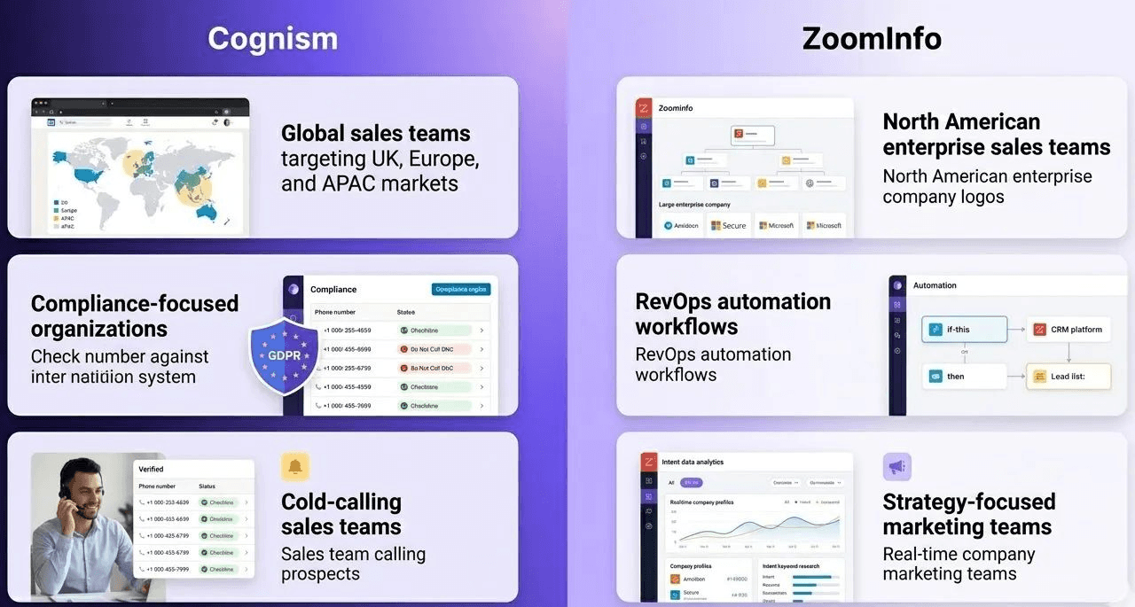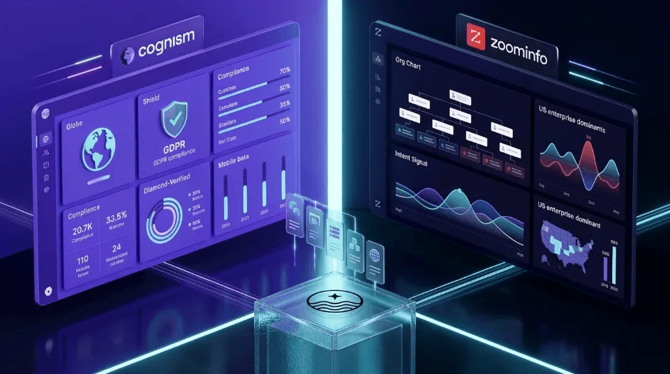 Cognism and ZoomInfo serve B2B teams differently, reflecting their core focus. Cognism emphasizes GDPR-compliant global lead generation and outbound-ready prospect lists, while ZoomInfo focuses on deep company intelligence, CRM integration, and multi-layered enrichment.