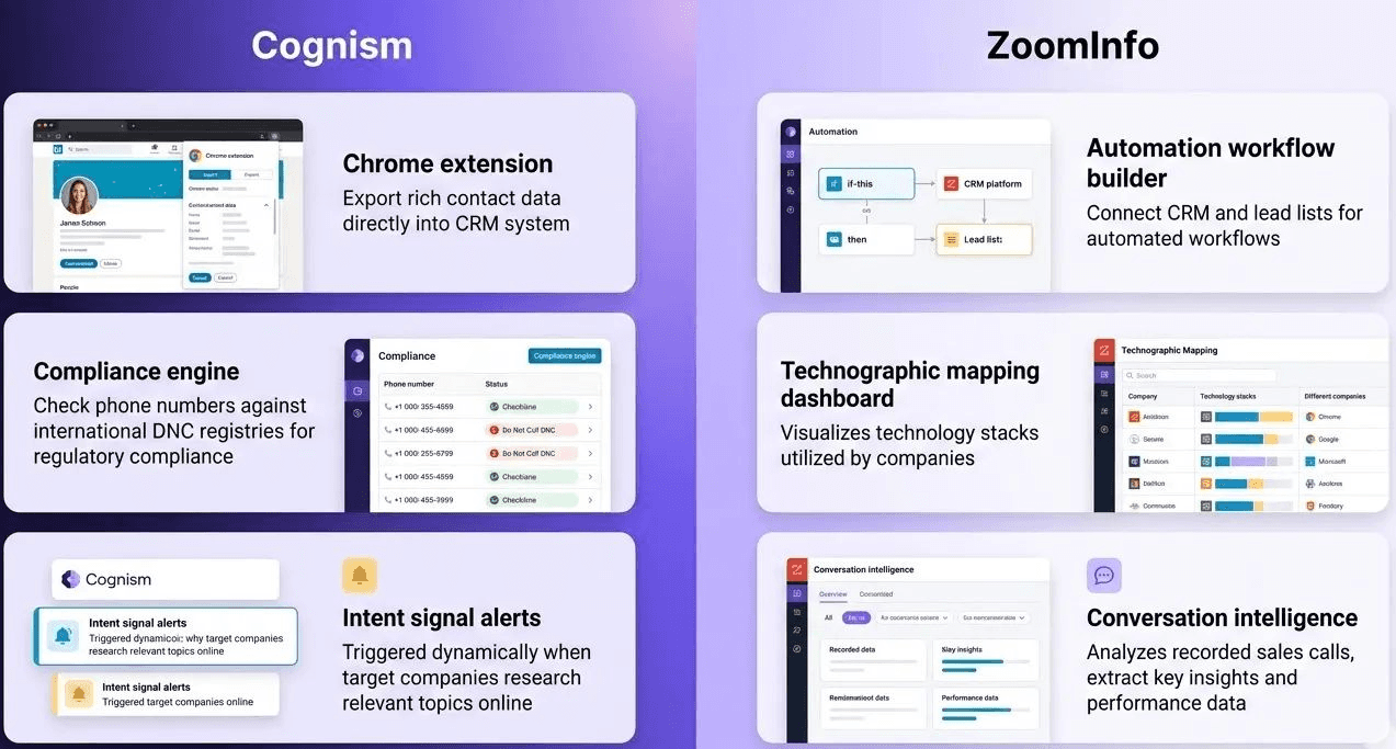 Key features differentiate Cognism and ZoomInfo by showing how each platform supports B2B teams beyond basic data access. Cognism emphasizes compliance, global reach, and outbound readiness, while ZoomInfo emphasizes integrated intelligence, automation, and analytics.